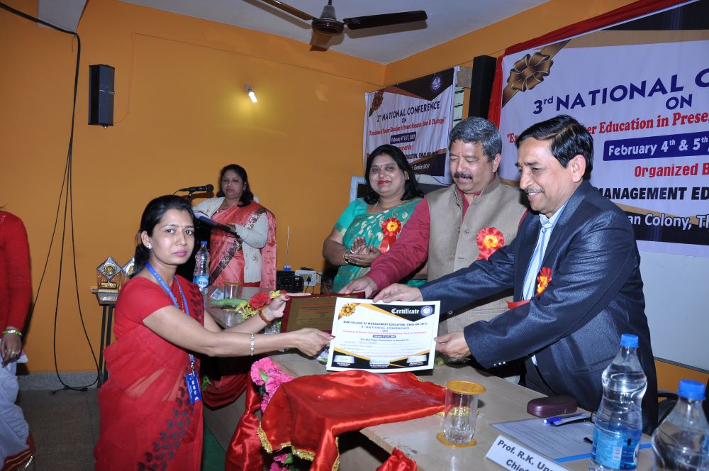 The Valedictory Session was forward with starting the worship of maa saraswati, we had as a guest of Honor of Valedictory Session Dr. R.K. Upadhyay (Principal Govt. P.G. College of Education Gwalior (M.P.) Resource Person was and Chairman was Professor Vivek Bapat SOS in Life Long Education Extension and Social Work Jiwaji University, Gwalior(M.P.) Chief Patron Mrs. Savita Singh, Chairperson & Mr. Manoj Singh Kushwah, Group Executive Director, Patron Mr. Abhishek Jain, Executive Director & Dr.M.R. Sahu, Principal (Management) and Conference Chairperson Dr. Deepika Bhatnagar Principal (Education) Conference Convener Dr. Manju Tomar BVM College of Management Education Gwalior.