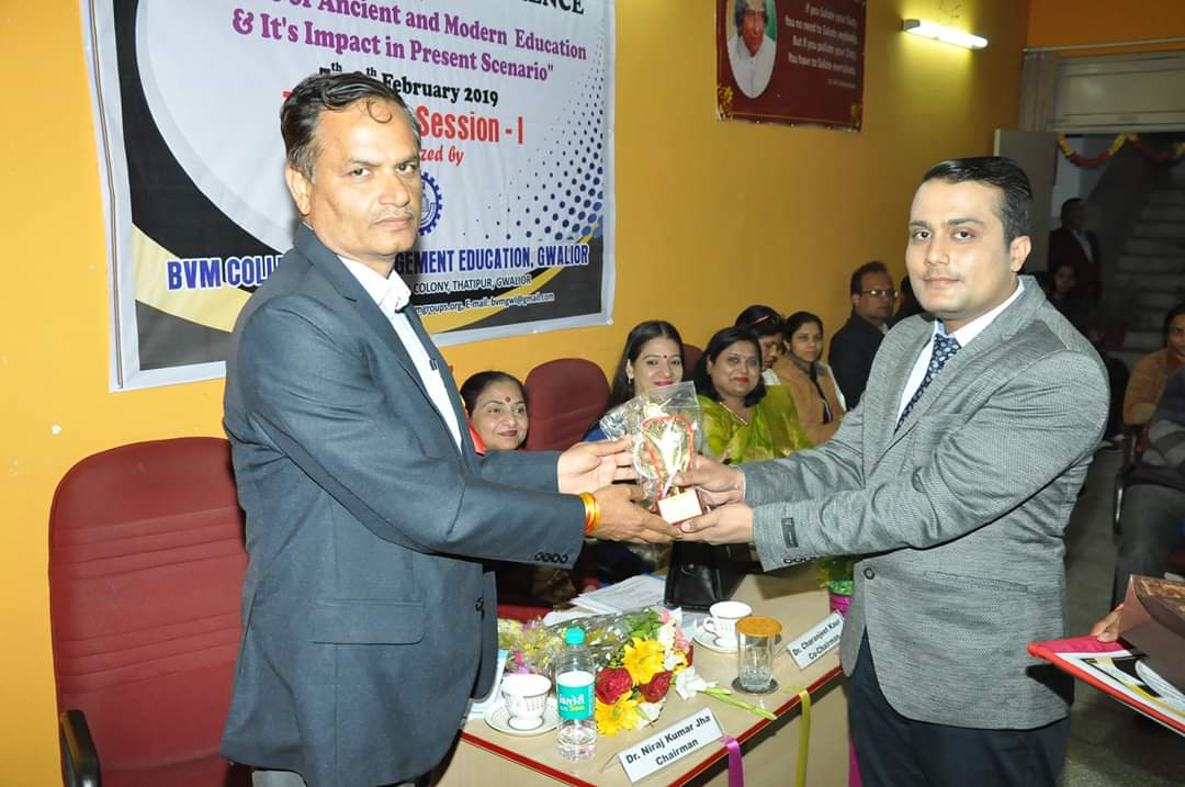 The Inaugural Session was forward with starting the worship of maa saraswati, The chief guest was Dr. Bhagirath Kumawat , Vice President Board of Secondary Education Bhopal (M.P.), Jiwaji. The Keynote speaker was Dr. T.C. Gyanai (Principal (Retd.) RCP Degree College Khaga, Kanpur (U.P.) .The session was chaired by Dr. U.C. Tiwari (Principal, (Retd.) Govt S.L.P. College Morar Gwalior (M.P.). The Chief Patron Mrs. Savita Singh, Chairperson & Mr. Manoj Singh Kushwah, Group Executive Director, Patron Mr. Abhishek Jain, Executive Director & Dr. M.R. Sahu, Principal (Management) and Conference Chairperson Dr. Deepika Bhatnagar Principal (Education) Conference Convener Dr. Shruti Chavhan Assistant Professor BVM College of Management Education Gwalior (M.P). Our college dignitaries welcomed the entire respected guest….Respected dignitaries were invited to deliver their wisdom words on the theme of the conference. On the first day one Technical session were conducted.