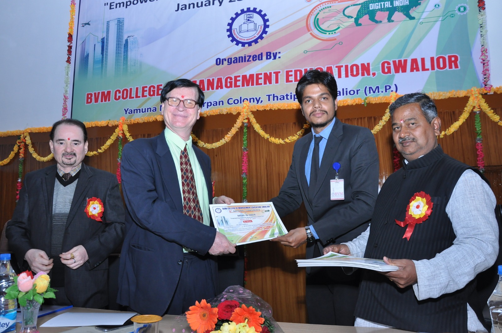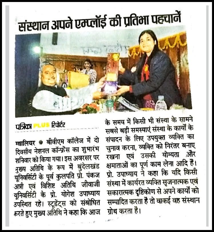Best Paper Presentation Award : Ms. Mamta Banoriya, a management student at BVM College of Management Education, Gwalior, for her research paper titled "Impact of Working Capital on Return on Assets (ROA) and Return on Equity (ROE) of Hero MotoCorp Limited".